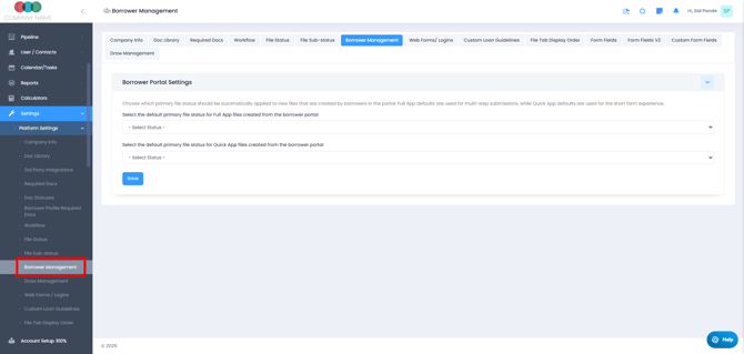 Control the default primary file status for Quick/Full Apps created by the Borrower from their borrower portal.