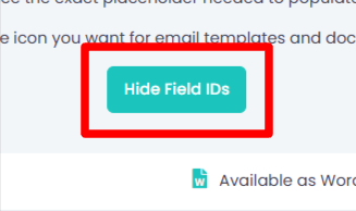 To build custom docs, we will need a pdf template with the placeholder/merge tags identified. Turn On the field IDs in order see the exact placeholder needed to populate on your custom templates, you will be using the clipboard icon 📋 to copy the field info for custom docs.