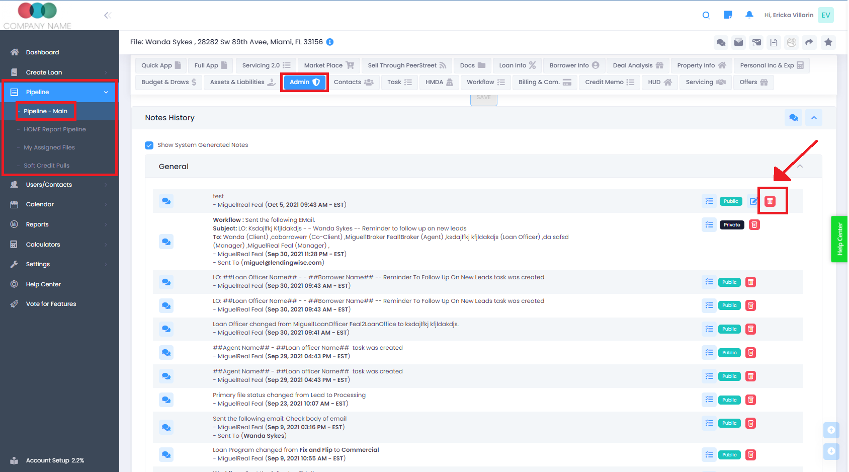 If you accidentally added a note to the wrong file, you can go to the admin tab in the file and you should have trashcans to delete notes