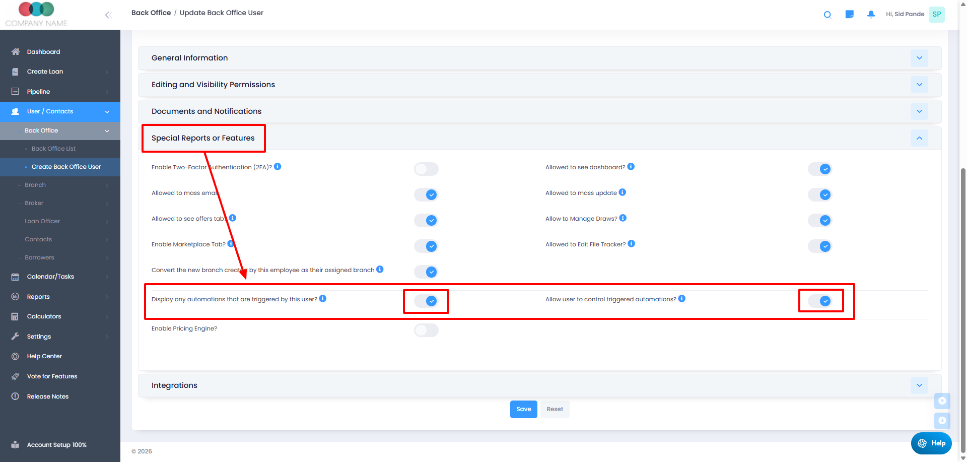 Navigate to User/Contacts > Back Office > Back Office List > click on users name > Scroll down to "Special Reports or Features"