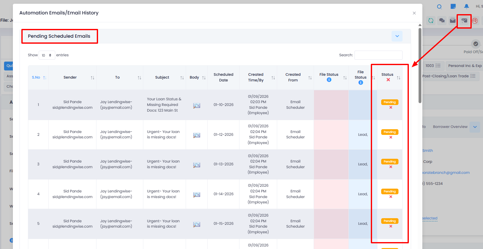 The Back Office user will now have the ability to either "Cancel All" pending automated emails or "Cancel" individual emails by clicking on the red "x" icon in the screenshot below: