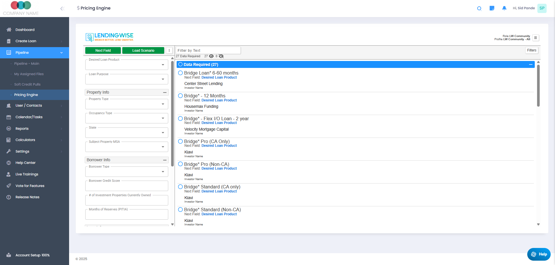 **Note: The pricing engine is for beta testing only. The guidelines are outdated. If you want a pricing engine, we will make an introduction to the 3rd party where you can purchase a plan and setup your lenders & their guidelines. Typical pricing is around $1500/mo and min $2500-$5000 setup depending on the # of lenders/investors & complexity.