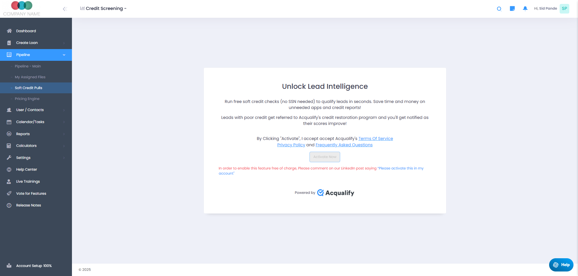 *Note: Please review Terms of Service, Privacy Policy and Frequently Asked Questions before activating the Soft Credit Pull feature with Acqualify.