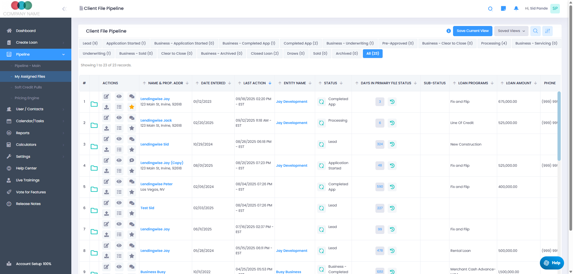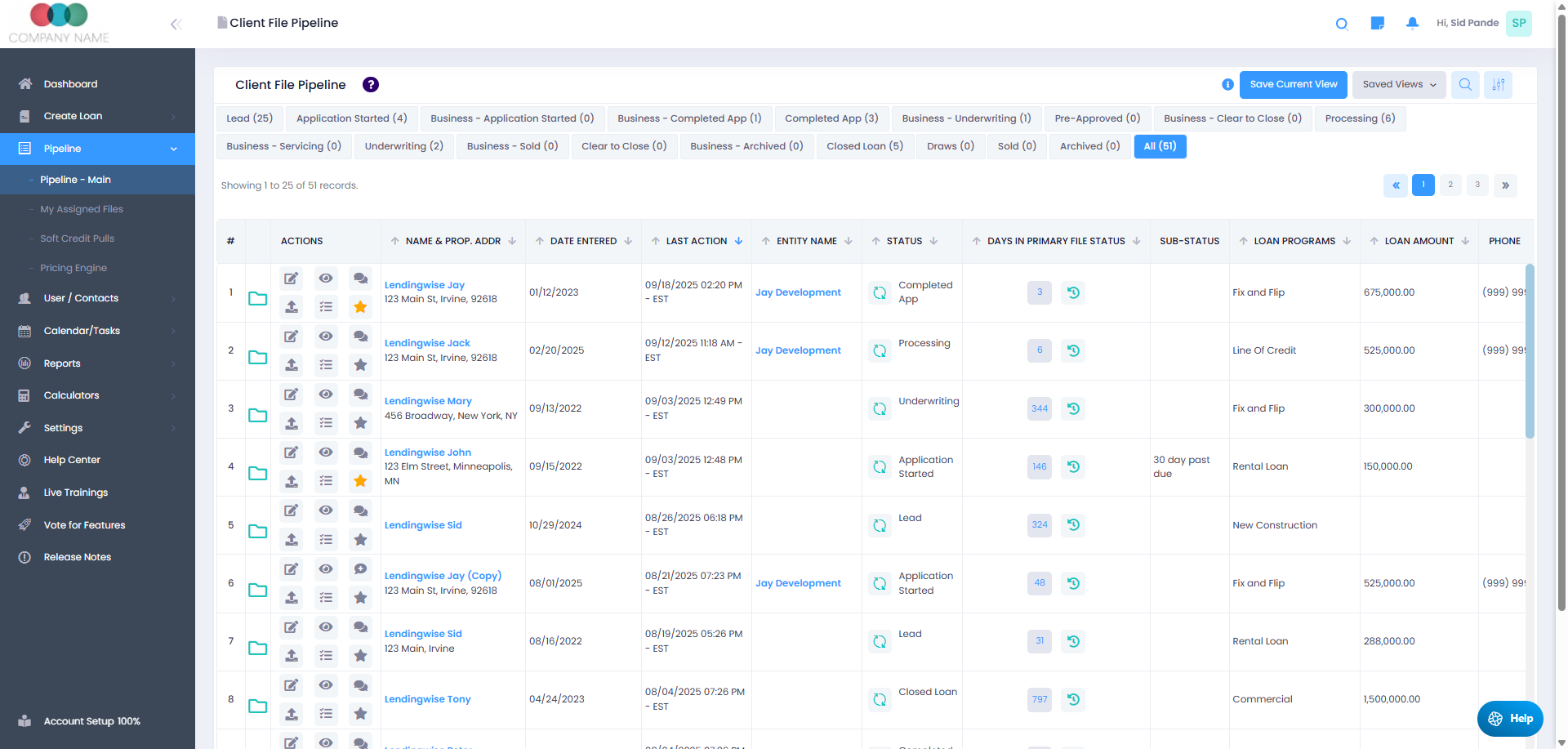 The Pipeline tab in LendingWise displays all active loan files, organized by status, user, or loan program. It’s the main workspace for tracking, filtering, and managing loans as they move through your custom loan workflow.