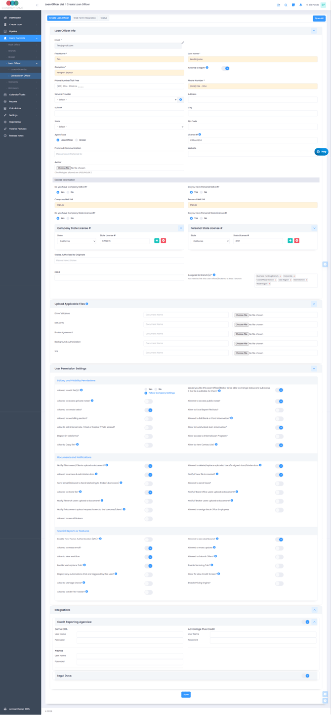 Navigate to: User/Contacts > Loan Officer > Loan Officer > Create Loan Officer