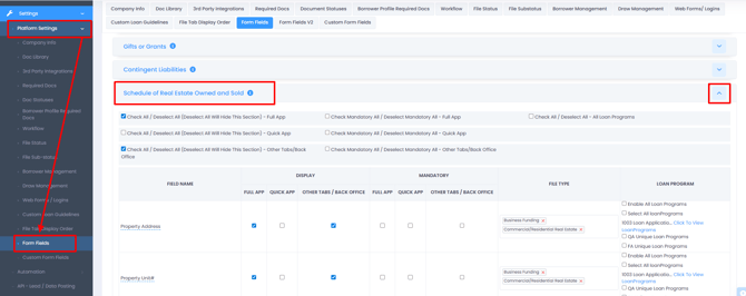 Navigate to: Settings > Platform Settings > Form Fields > Scroll down to the "Schedule of Real Estate Owned and Sold" section > Enable the form fields desired for the Quick App, Full App and Back Office fields.